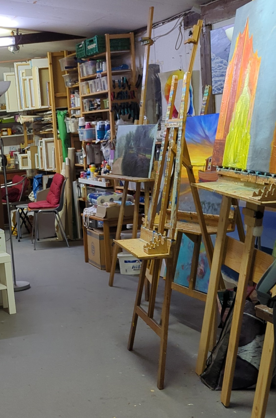 Im Stall des Ferckschen Landarbeiter Hauses (nun die KunstKateVolksdorf) sind Staffeleien, Pinsel, Farben, Stühle, Hocker, eine Kaffeemaschine, Bleistifte, Buntstifte, Pastell + Ölkreide …